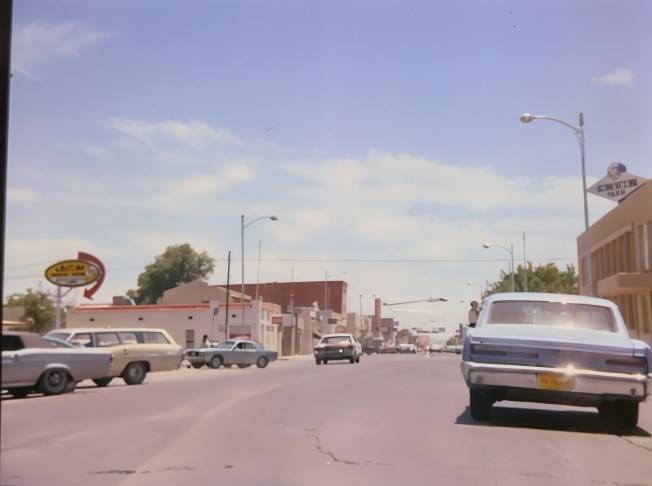 The filming of the 1971 movie The Honkers brought a touch of Hollywood to Carlsbad, New Mexico, where my grandparents’ restaurant became a quick backdrop, its sign featured to the left in this image, in the production. Shot on location from May to July, the film captured the rugged charm of the area, with the entire crew dining at the restaurant, savoring the home-cooked meals that reflected our family legacy. My grandparent’s tales highlight the warmth of Slim Pickens, whose friendly demeanor left a lasting impression, while James Coburn’s more reserved nature stood in contrast, adding an intriguing dynamic to the behind-the-scenes stories shared by those who witnessed the shoot.